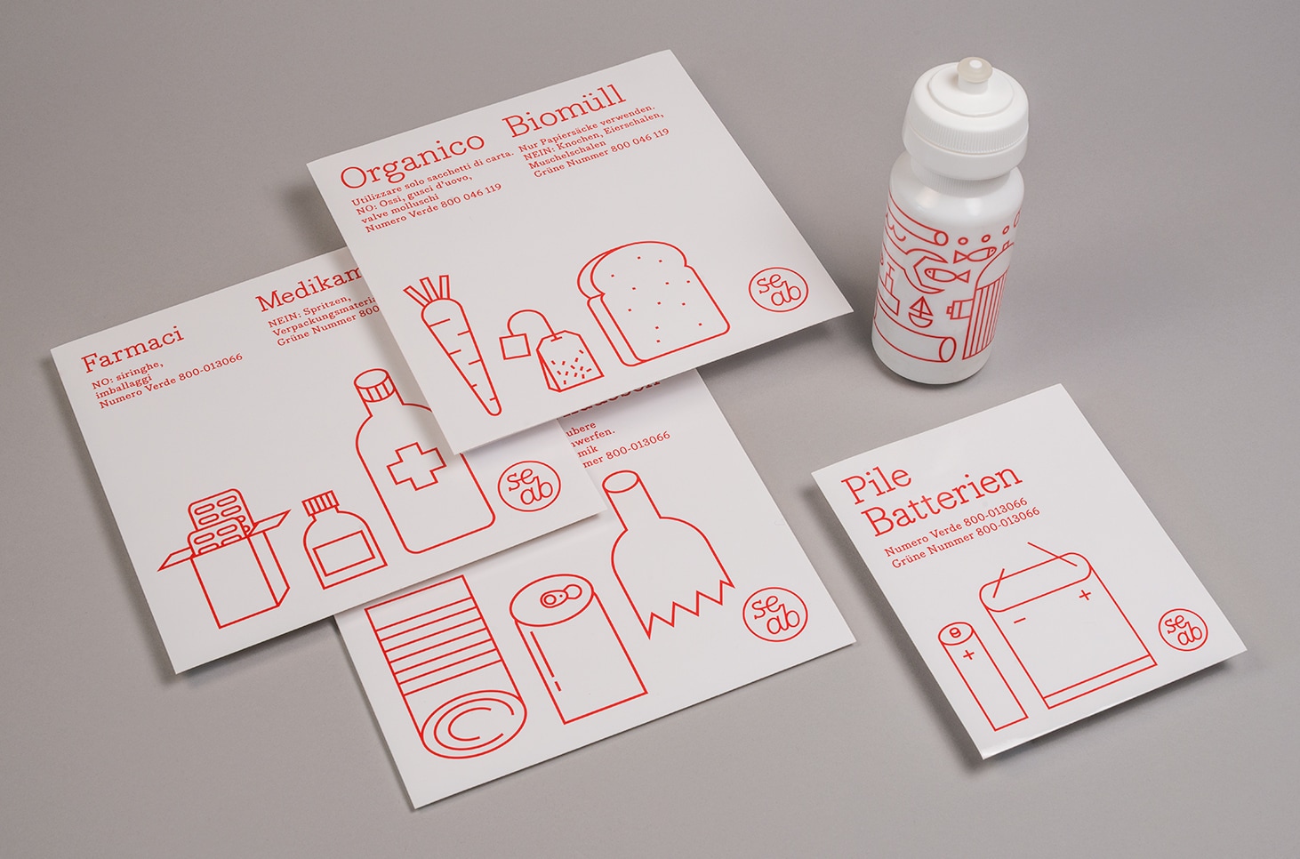 Diverse Piktogramme für die Beschilderung eines Recyclinghofes des Umweltbetriebes SEAB in Bozen, Italien.